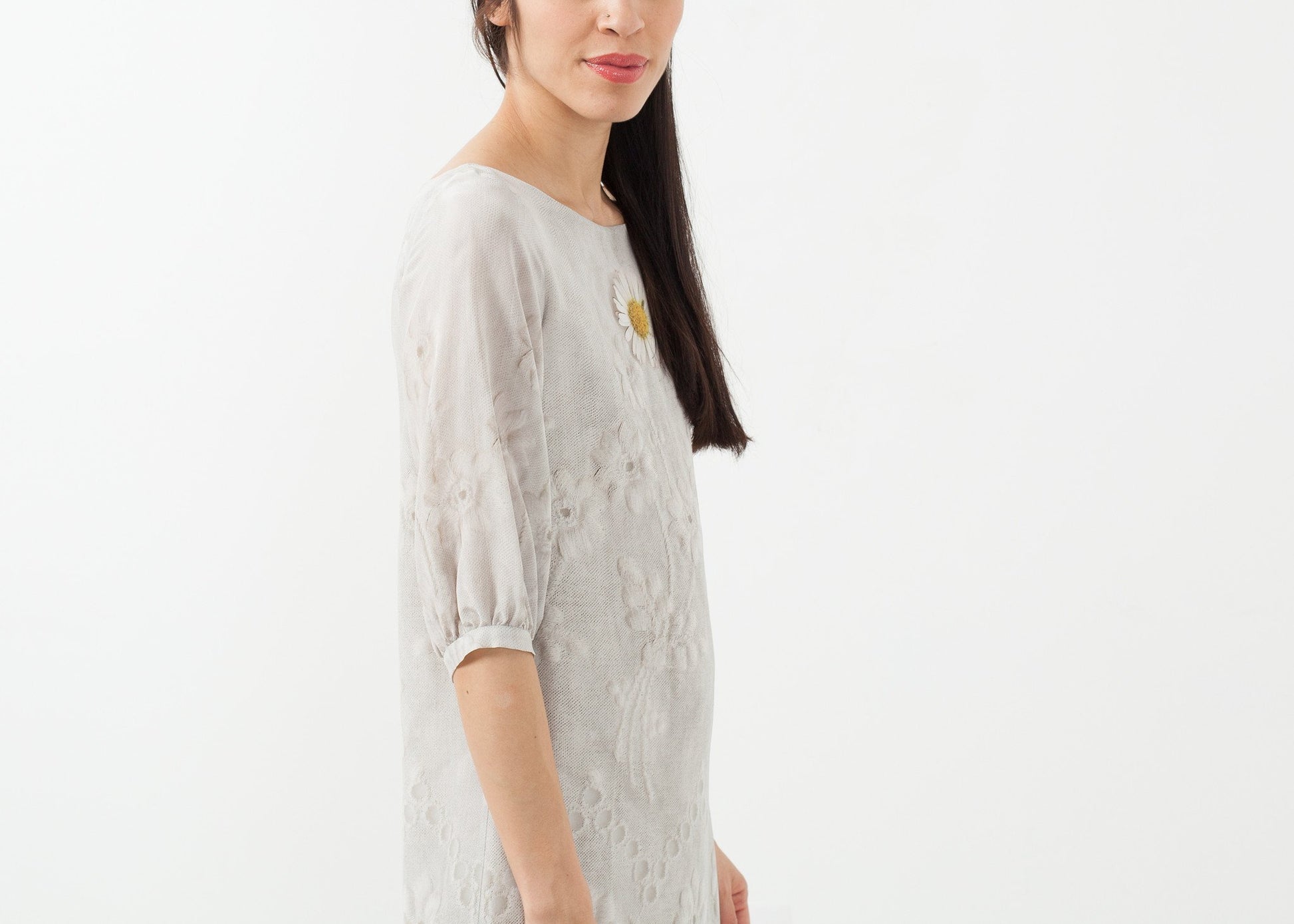 The designs of Antoni & Alison are a melange of trompe l'oeil digital imagery printed on fine silks, rendering a specified aesthetic that defines the brand and culls a dedicated clientele. The Daisy delights with its subtle textural printing and details. Flowing peasant sleeves. Wide boat neckline. Lining. Color Grey. 100% Silk. Made in the U.K. Ashley is wearing a Size 8.