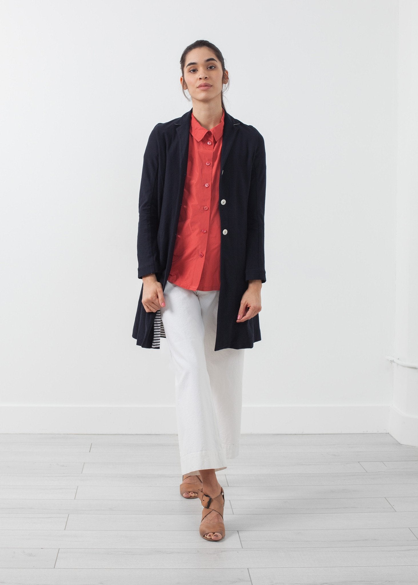 The Halo is a classic trench with the comfort of cotton. Three button placket closure. Exterior pockets at side. Fully lined. Yoshi Kondo. Color Navy. 100% Cotton, Lining 100% Cotton. Made in Romania. Ashley is wearing a Small.